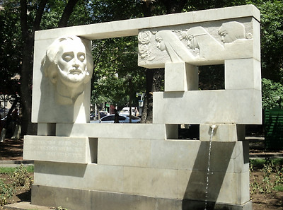 예레반의 사야트 노바에 대한 소련 시대 분수 기념비, 그의 이름을 딴 음악 학교 옆에는 음유시인이 남코카서스 국가 중 하나를 대표하는 세 명의 젊은 여성과 마주하고 있는 모습이 있습니다.
