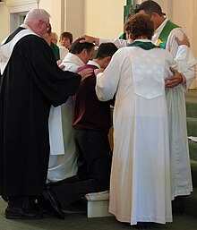 - 집사들은 또한 루터교,[18] 감리교[19] 그리고 대부분의 침례교 전통에서 안수를 받는다. [20]