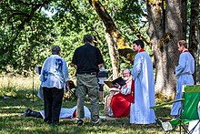 야외 성공회 서품식에서 사제 서품을 받는 집사는 앉아 있는 주교 앞에 엎드린다.