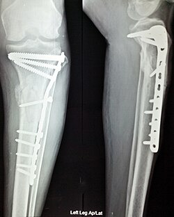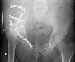 인공관절수술은 근골격 관절의 관절면을 절골술 이나 다른 시술을 통해 교체, 재형성 또는 재정렬하는 정형 외과 수술입니다. [ 25 ] 관절염( 류마티스 수술 )이나 다른 유형의 외상 으로 인한 손상 후 통증을 완화하고 관절 기능을 회복하기 위해 시행하는 선택적 시술입니다 . [ 25 ] 표준적인 전체 무릎 교체 수술 외에도 관절염이 있는 무릎의 체중을 지탱하는 표면 하나만 교체하는 단일 구획 무릎 교체 수술도 시행할 수 있지만 [ 25 ] 재수술의 위험이 상당히 있습니다. [ 26 ] 인공관절 교체는 다른 관절, 특히 고관절 [ 27 ] 이나 어깨 에 사용됩니다 . [ 28 ]