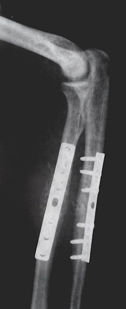 요골과 척골 골절을 치료하기 위한 정형외과 임플란트. 척골의 눈에 띄는 골절을 확인하세요. (오른쪽 아래팔)