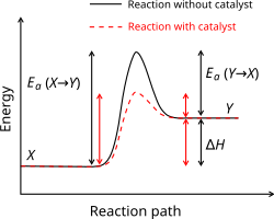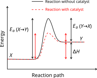 가상의 흡열 화학 반응에서 촉매의 효과를 보여주는 일반 퍼텐셜 에너지 다이어그램. 촉매의 존재는 활성화 에너지가 낮은 새로운 반응 경로(빨간색으로 표시됨)를 열어줍니다. 최종 결과와 전체 열역학은 동일합니다.