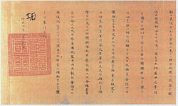 한일 병탄 조약시 전권위임장. 관례와는 다르게 순종의 이름(坧)이 서명에 들어갔다. 그러나 坧은 순종의 친필이 아니다.