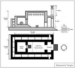 고고학자들은 솔로몬 성전에 대한 성경적 묘사를 랑바우 건물로 분류합니다. 즉, 너비보다 긴 직사각형 건물입니다. 또한 3개의 유닛으로 구성된 삼자 건물로 분류됩니다. 울람(현관), 헤이칼(성소), 데비르(지성소). 또한 직축 사원으로 분류되는데, 이는 입구에서 가장 안쪽 신사까지 직선이 있다는 것을 의미합니다. [53]