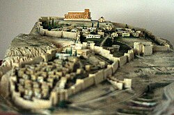 예루살렘 성벽 국립공원에서 솔로몬 통치 (기원전 10 세기) 동안 예루살렘의 현대 재건. 성전은 기원전 1세기에 헤롯 왕이 확장하기 전의 모습대로 원래의 모리아 산 위에 서 있습니다
