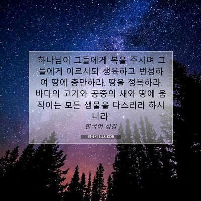 "하나님이 그들에게 복을 주시며 그들에게 이르시되 생육하고 번성하여 땅에 충만하라, 땅을 정복하라, 바다의 고기와 공중의 새와 땅에 움직이는 모든 생물을 다스리라 하시니라"