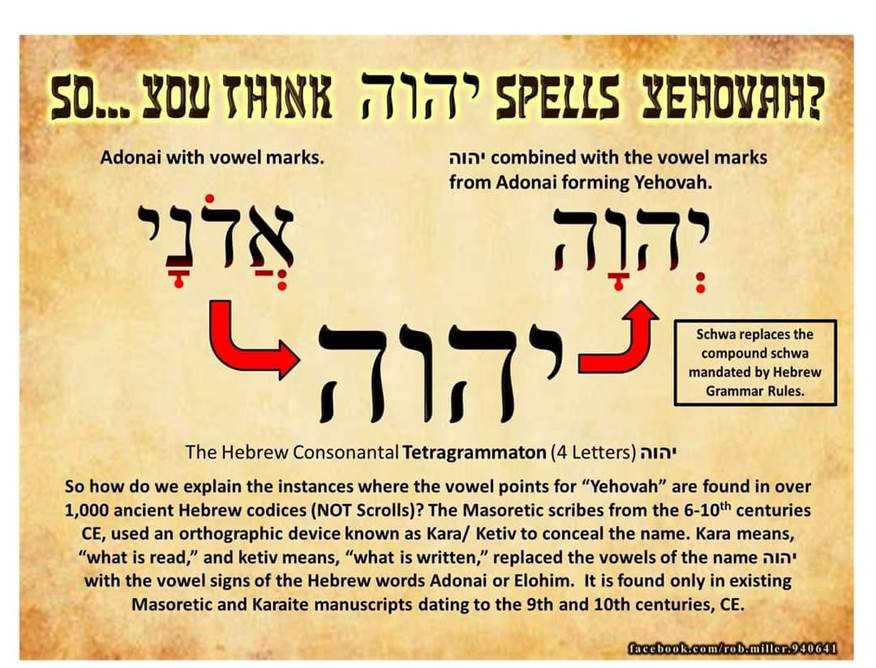 마지막 한마디: 이름(יהוה)을 발음할 줄 안다고 주장하는 기독교인들은 착각에 빠져 있습니다. 예를 들어, 다음과 같은 사람들 여호와로 발음해야 합니다. 히브리어에는 'J' 소리가 없다는 것을 알지 못하니까요(분명히 이름은 히브리어 이름일 것입니다!). 추가로, 여호와에서 "o"와 "a" 소리를 내는 데 사용되는 모음점은 다음과 같습니다. 사실은 모음 대신 '아도나이'라고 말하게 하는 기억 장치입니다 발음에 사용되는 포인트.
