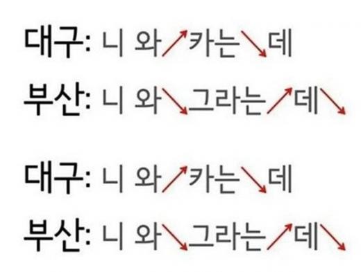 대구에서는 “니 와 카는 데”에서 ‘와’는 높이고 ‘는’에서 억양을 내린다. 반면 부산에서는 “니 와 그라는 데”에서 ‘와’는 억양을 내리고 ‘는’에서 높인다.