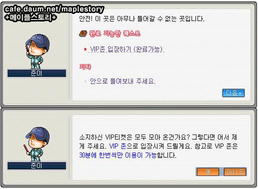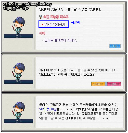 ▲요약: 커닝 스퀘어 모든 몬스터들에게서 얻을 수 있는 VIP 티켓 10장을 모아오면 VIP존을 이용할 수 있게 해주겠다.