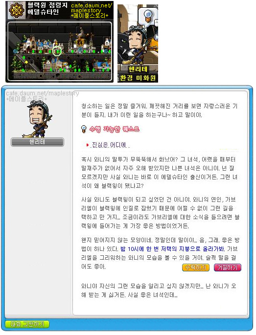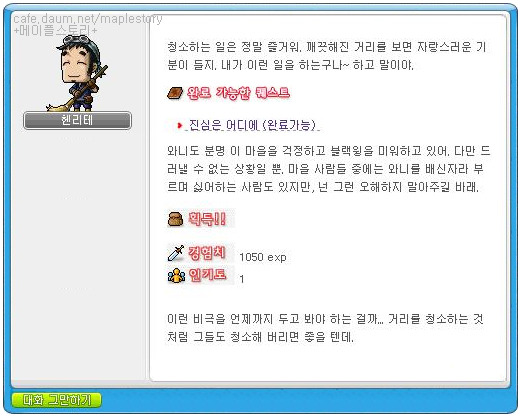 다시 헨리테에게 돌아가시면 퀘스트 완료입니다.