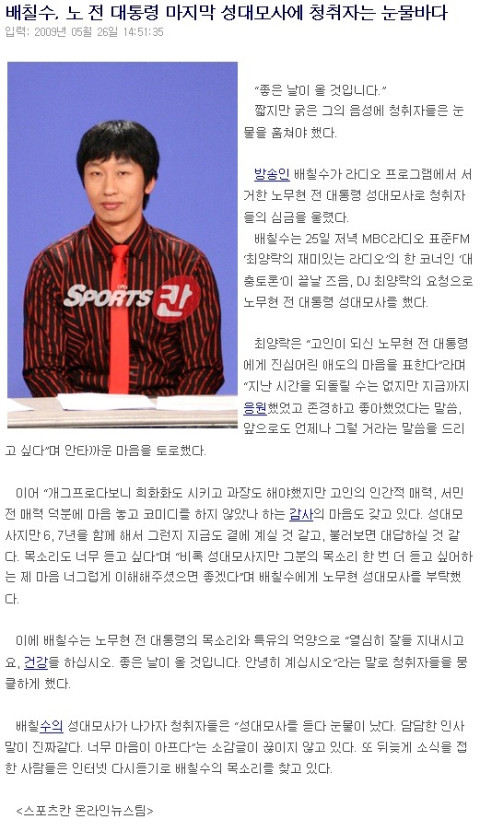 [스크랩] [감동적인]어제 배칠수 노무현 성대모사 ( 파일첨부) 작성자[브로아]헤어스타이르|작성시간09.05.26|조회수537 목록 댓글 2 글자크기 작게가 글자크기 크게가 곰녹음기_2.mp3 성대모사는 1분 34초부터 재생됩니다.. 고인의 명복을 빕니다. 아빠보고싶어요. 첨부파일첨부된 파일이 2개 있습니다. jpg 파일 2009-05-26 15;18;35.jpg 다운로드 mp3 파일 곰녹음기_2.mp3 다운로드 다음검색 스크랩 원문 : 비공개카페 현재 게시글 추가 기능 열기 북마크 공유하기 신고 센터로 신고 댓글 댓글 2 댓글쓰기 답글쓰기 댓글 리스트 작성자[갈리]후우스우치이 | 작성시간 09.05.26 아 정말 슬프네요. 작성자[아케니아]유니힐법 | 작성시간 09.05.27 정말 똑같네요.... 댓글 전체보기