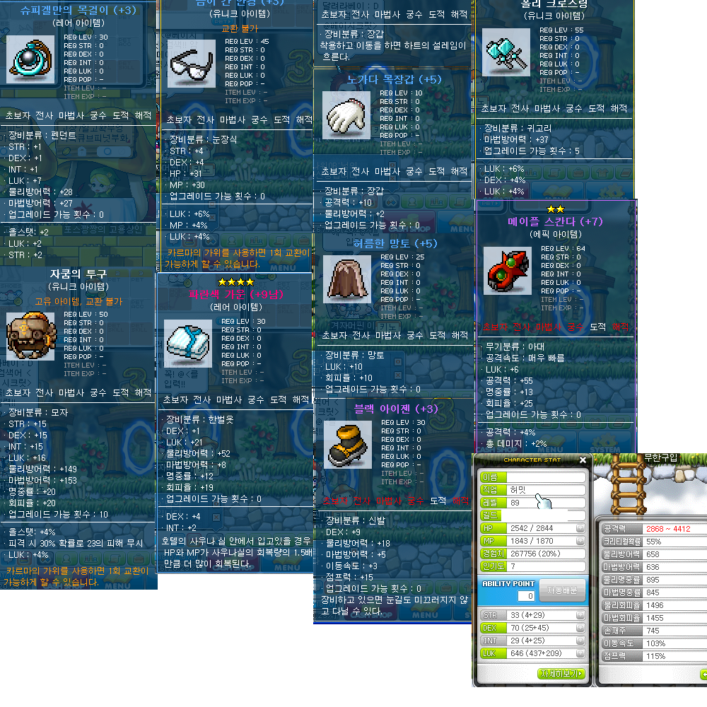 일단 80제 상하의신발 71제이상 귀걸 (잠재작된거/덱작된걸루요그래야 나중에 순덱25로 리버스가능 올템덱작 잠재는 럭%)에 혼슈겔,불벨 끼시면 될것같네요
