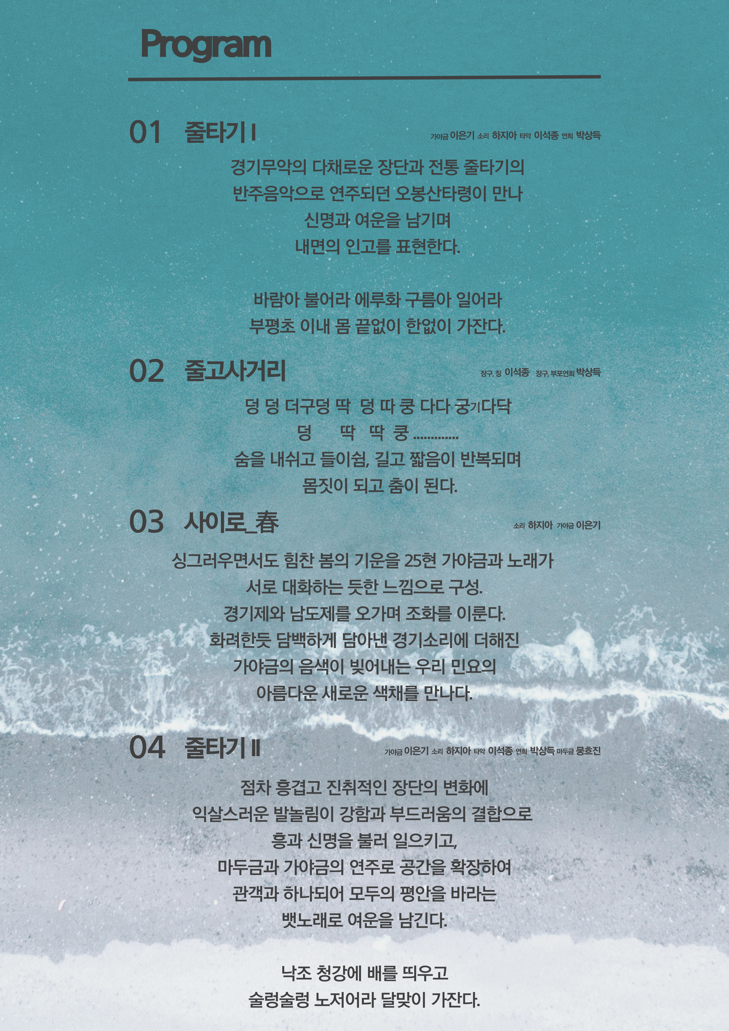 등의 곡들을 선보이며, 몽골악기 마두금의 게스트 연주도 함께하는