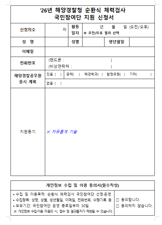 2026년 해양경찰청 채용 순환식체력검사 국민참여단 모집 알림