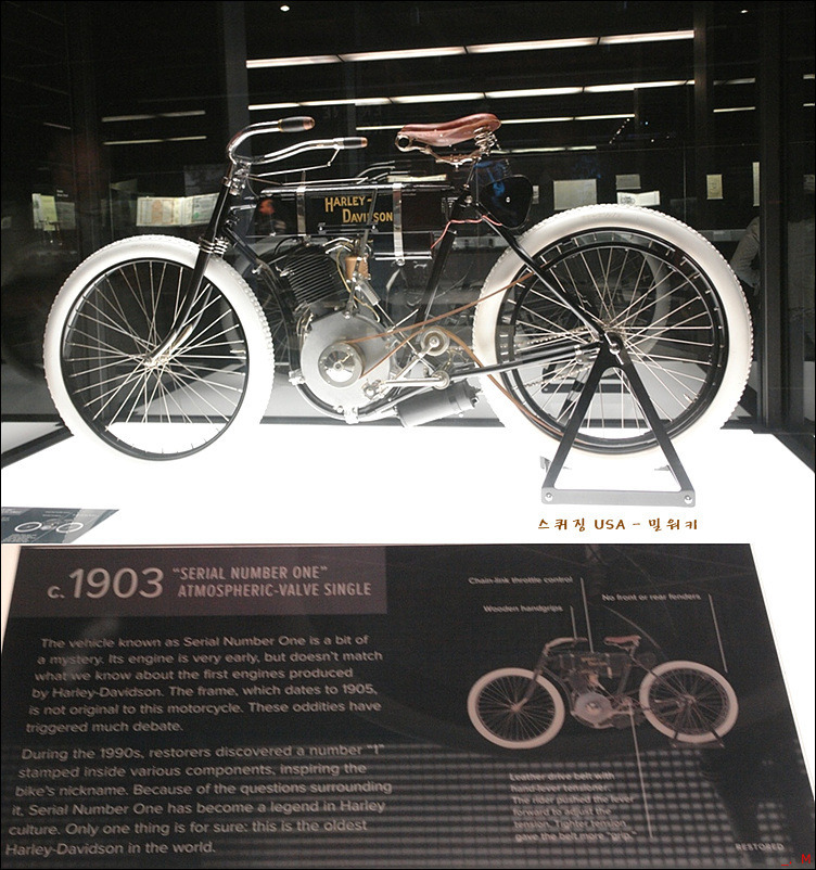 1903년에 만든 최초의 할리 데이비슨 모델이 전시되어있다. 자전거 오토바이라 불리워도 무방할, 조금은 심플하지만, 일반인들이 쉽게 이해할 수 있는 모델이다.