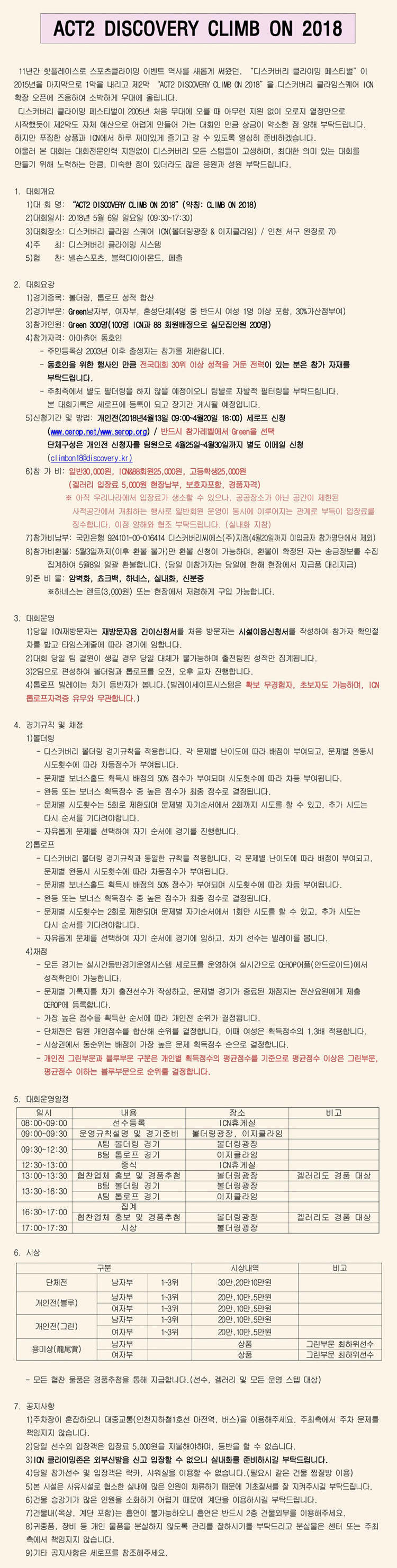 [스크랩] "ACT2 DISCOVERY CLIMB ON 2018" ICN 동호인 볼더링&톱로프 대회안내 작성자초크맨(오현규)|작성시간18.04.06|조회수67 목록 댓글 0 글자크기 작게가 글자크기 크게가 * 참가신청: www.cerop.net* 문의메일: climbon18@discovery.kr 다음검색 스크랩 원문 : 등반세계 현재 게시글 추가 기능 열기 북마크 공유하기 신고 센터로 신고 댓글 댓글 0 댓글쓰기 답글쓰기 댓글 리스트