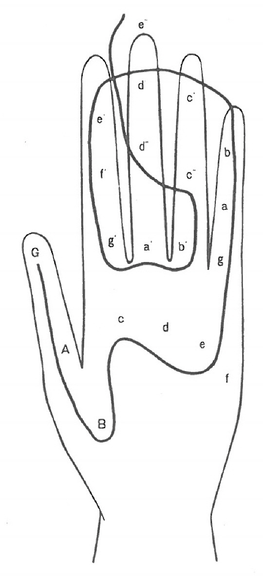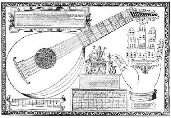 중세의 유명한 이론가인 귀도 다레쪼(992경∼1050)의 이름에서 비롯된 것이다. 왼손 각 부분에 음이름을 적어 놓고 음계와 솔미제이션을 외는 데 도움이 되도록 한 것. 중세 헥사코드의 모든 체계와 음이름 및 계이름의 관계를 한눈으로 이해할 수 있도록 한 점에서 매우 중요한 가치가 있다. 교회 선법의 요약으로서 취급되었으며, 훗날 16세기에 반음계주의가 귀도의 손에 없다는 이유로 강경한 반대를 받았다. 그림에서는 현재의 음이름을 사용하고 있다고 합니다.