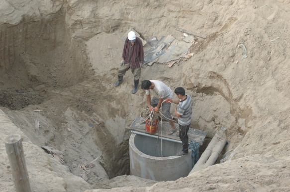 매몰 된 흙을 파내고, 시멘트 관을 넣습니다.
