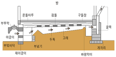 온돌 내부구조의 주요부분은 아궁이와 고래입니다.온돌은 연료가 아궁이에서 타서 부넘기를 통해 열과 연기를 고래로 이끌어 들이는 구조로 방고래로 들어가면서 급경사를 이루어 높아지다가 다시 약간 낮아지는 부넘기가 있습니다.부넘기는 불길을 잘 넘어가게 하고 불을 거꾸로 내뱉지 않도록 합니다.고래는 열과 연기가 지나가는 통로로 여러 종류가 있습니다.불길이 고래에서 굴뚝으로 연결되기 전에 고래보다 깊이 파인 골이 있어 재나 연기를 머무르게 하는데 이를 개자리라고 합니다.여기에 열과 연기가 머물다가 굴뚝으로 빠져나가므로 구들의 온기를 더욱 오래 유지할 수 있습니다.