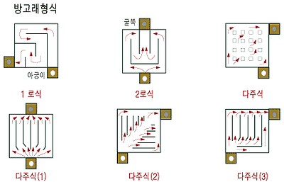 고래라는 이름은 그 모양에서 따온 것으로, 될수록 열이 분산되어 구들이 골고루 따뜻하도록 고안하였습니다.화살표는 열과 연기가 지나가는 것을 뜻합니다.