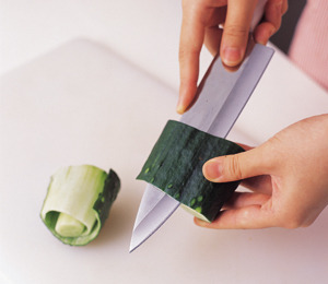레서피에 오이, 애호박, 대추 등을 돌려 깎는다는 말이 자주 나온다. 일단 재료를 4~6㎝ 길이로 토막 내고(더 길면 돌려 깎기가 힘들다) 칼 중간 부분으로 살살 밀면서 돌려야 손도 다치지 않고 섬유질도 꺾이지 않는다.