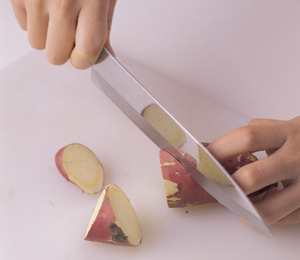 수육이나 뜨거운 떡처럼 모양이 흐트러지기 쉬운 재료를 썰 때 단칼에 내리치면 재료가 뭉개지고 두껍게 잘린다. 이때는 일단 왼손으로 재료를 쥐고(이때 포크를 사용하면 편리하다) 칼에 물을 살짝 바른 뒤 살짝살짝 흔들어가면서 자른다.