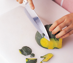 단호박은 껍질이 단단해 사과 깎듯이 손으로 밀어 깎거나 필러로 깎으면 손을 다치기 쉽다. 단호박을 반이나 ¼ 크기로 잘라 단면이 도마 바닥으로 가게 놓고 칼로 빚듯이 껍질을 벗긴다.
