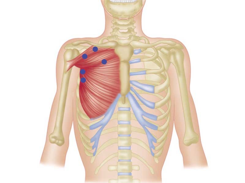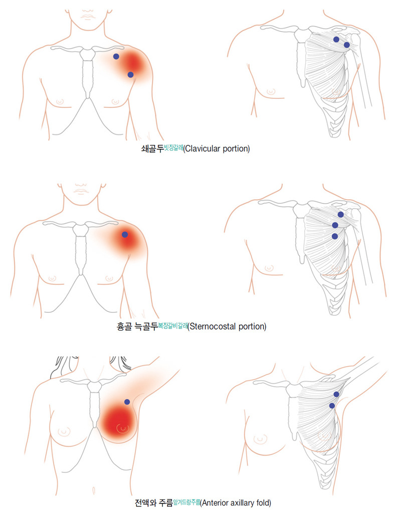 연관통 패턴(Referred pain patterns) 쇄골부분(Clavicular portion): 국소 통증이 앞 삼각근(어깨세모근)(Deltoid)과 상완이두근(위팔두갈래근)(Biceps brachii) 장두(긴갈래)(Long head) 부분으로 방사된다.