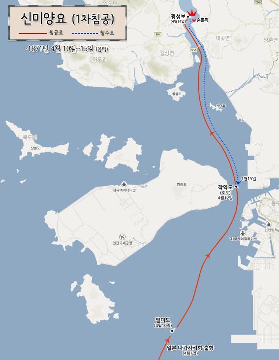 - 6월2일-9일(음력 4.14-22) : 조선군의 포격에 별다른 반격을 가하지않고 작약도로 돌아온 미군은 조선조정에