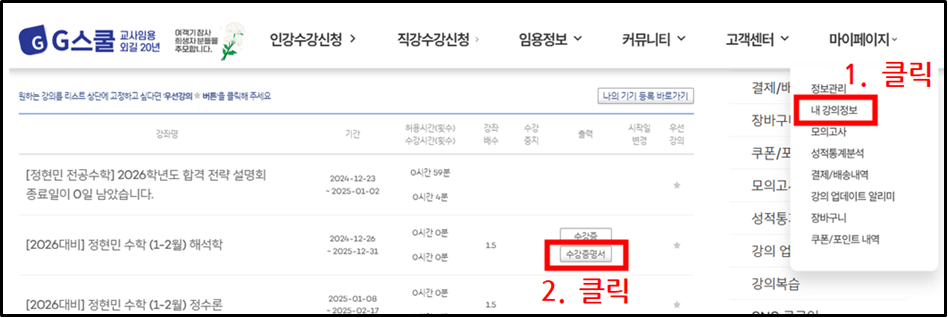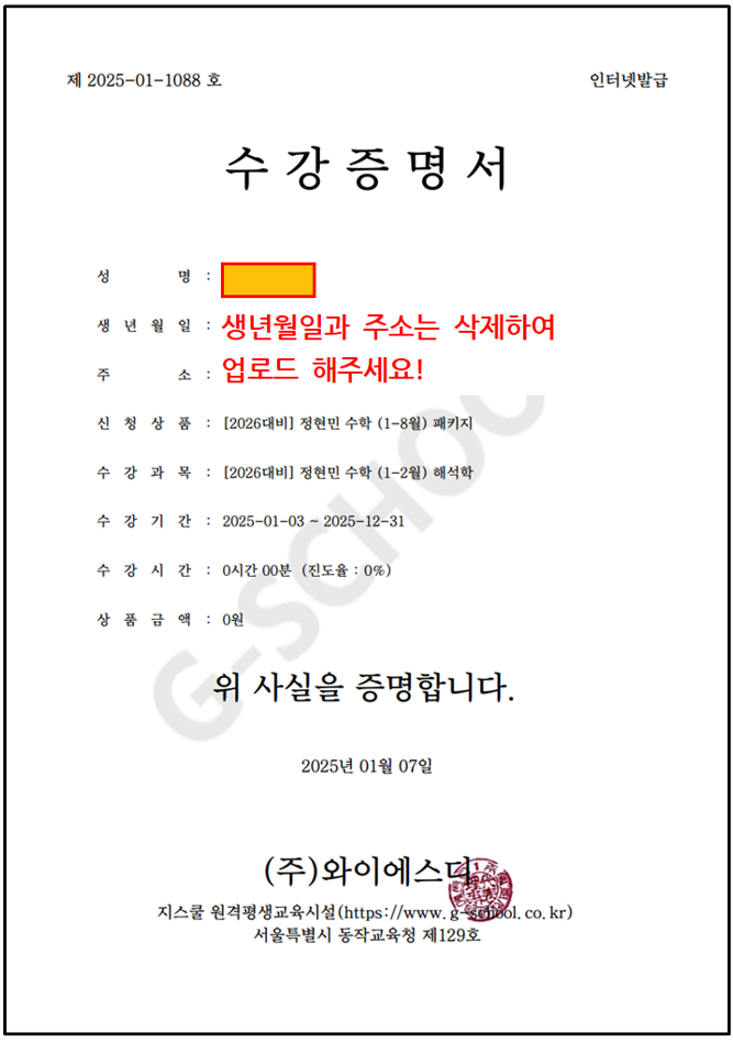 ※ 수강증명서에 2시간 이상 수강시간이 확인되어야 합니다.