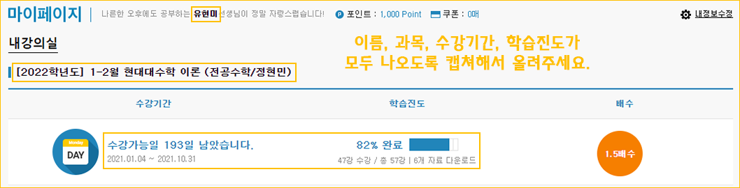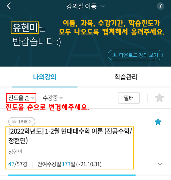 ※ 캡쳐 인증에 이름, 학습 진도가 모두 보여야 하며 3강 이상 수강 확인되어야 합니다.