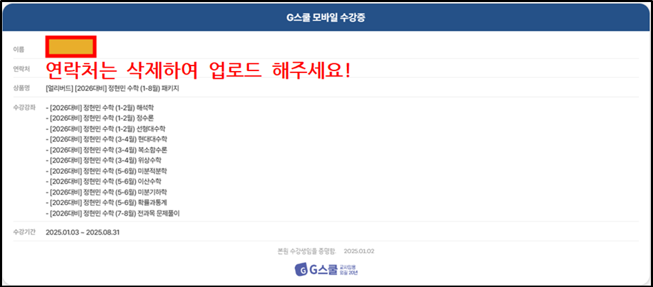 이름, 학원 아이디, 인증사진(아래 인증방법 예시 참고)