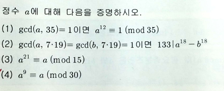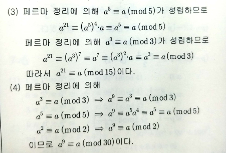 페르마정리 작성자ha:)|작성시간19.02.08|조회수54 목록 댓글 2 글자크기 작게가 글자크기 크게가 연습문제 5-1.(3),(4)정수 a라고만 나와있지 p가 a를 나누지않는다(p가 a의 약수가 아니다)라는 말이없는데 페르마정리 사용가능한가요? 다음검색 현재 게시글 추가 기능 열기 북마크 공유하기 신고 센터로 신고 댓글 댓글 2 댓글쓰기 답글쓰기 댓글 리스트 작성자쿨여누 | 작성시간 19.02.08 (i)p|a인 경우a==0(mod p)이므로 a^p==0==a(mod p) 가 성립.(ii)p가 a를 나누지 않는경우페르마의 작은정리에 의해 a^(p-1)==1(mod p) 이므로 a^p==a(mod p) 가 성립.이렇게 경우를 나눠서 설명할수있습니다. 답댓글 작성자ha:) 작성자 본인 여부 작성자 | 작성시간 19.02.08 감사합니다!^^ 댓글 전체보기