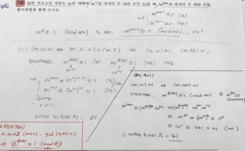 오일러 정리 작성자밍고|작성시간20.04.02|조회수319 목록 댓글 1 글자크기 작게가 글자크기 크게가 제가 어느부분에서 틀렸는지 모르겠습니다ㅜㅜ 한번읽어봐주시면 감사하겠습니다! 다음검색 현재 게시글 추가 기능 열기 북마크 공유하기 신고 센터로 신고 댓글 댓글 1 댓글쓰기 답글쓰기 댓글 리스트 작성자정현민 수학[박정환] | 작성시간 20.04.02 혹시 저희 자료라면 수정이 필요한듯 한데, 어디서 보신 문제인지 알 수 있을까요?m^15==11 (mod 25) 을 만족하는 정수 m은 존재하지 않고 문제가 잘못되었습니다.(글씨가 흐릿해서 잘 안보이지만 60=15*4인 것으로 봐서 m^15가 맞죠?) 댓글 전체보기