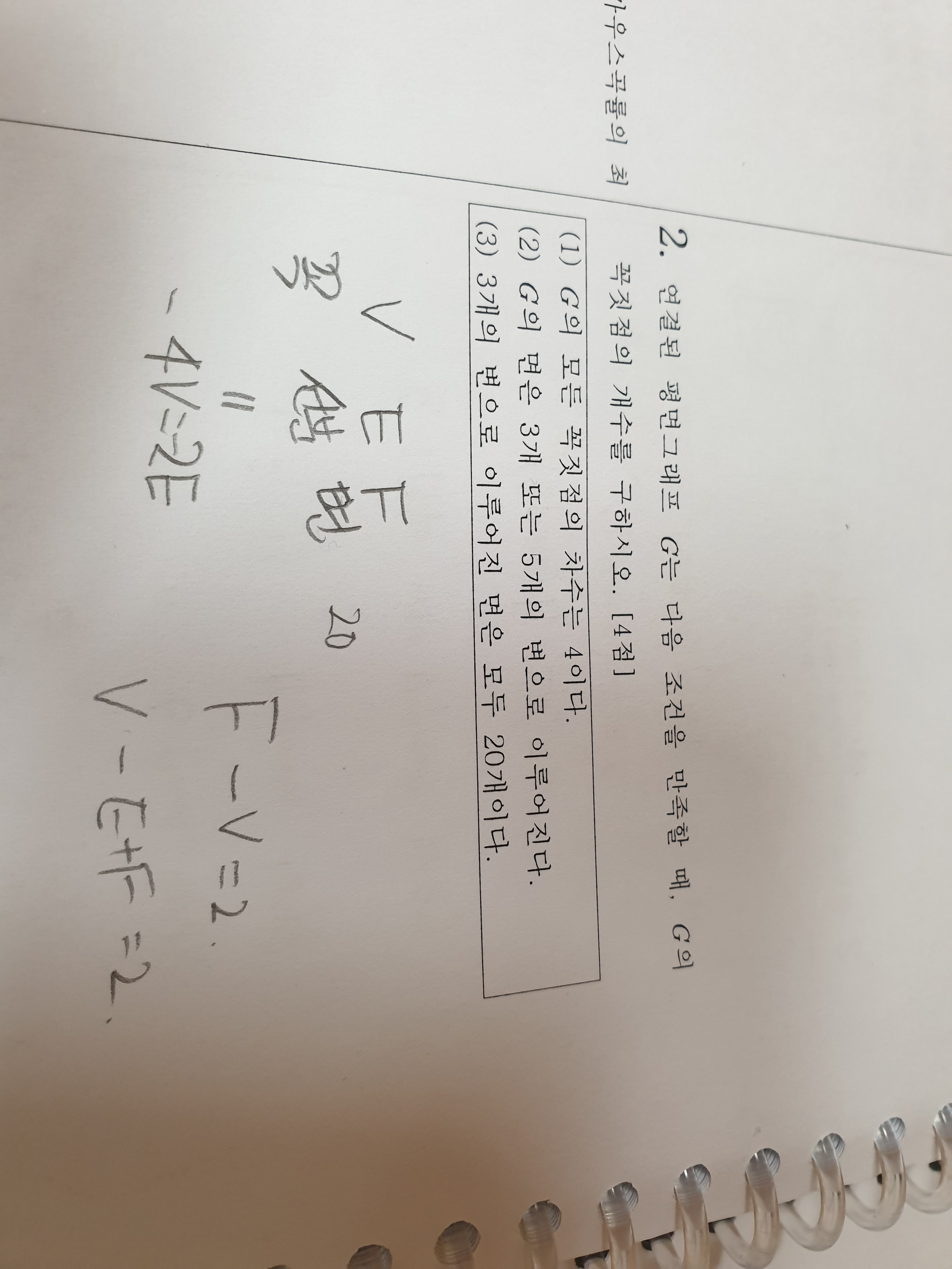 평면그래프문제입니다 작성자15조건우|작성시간20.02.27|조회수372 목록 댓글 1 글자크기 작게가 글자크기 크게가 쉬운거같으면서도 어떻게해야할지.. 다음검색 현재 게시글 추가 기능 열기 북마크 공유하기 신고 센터로 신고 댓글 댓글 1 댓글쓰기 답글쓰기 댓글 리스트 작성자정현민 수학[유현미] | 작성시간 20.02.29 다음부터는 사진 방향이 똑바로 보이도록 올려주세요.5개의 변으로 이루어진 면의 개수를 a라 하면, f=a+20 이고 2e=3x20+5a 이므로 4v=2e, v-e+f=2와 연립해주시면 됩니다. 댓글 전체보기