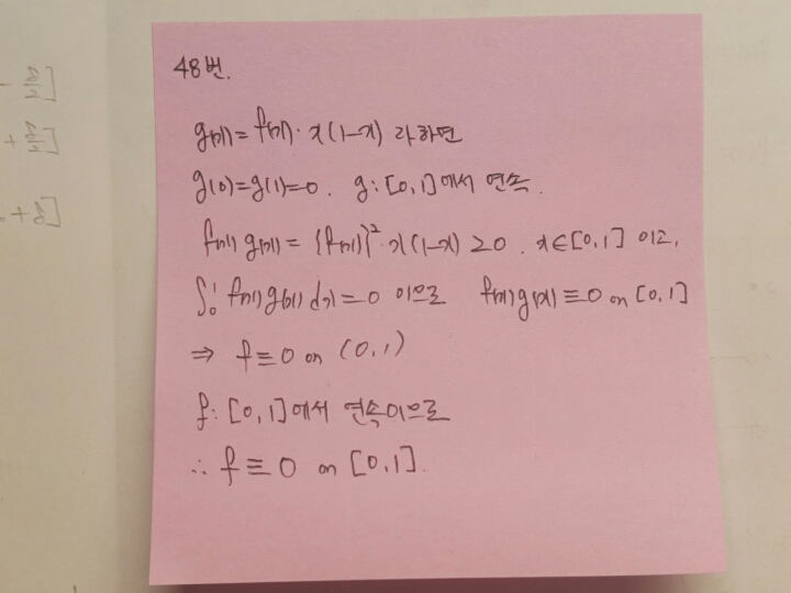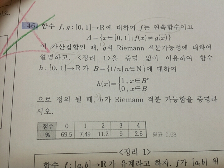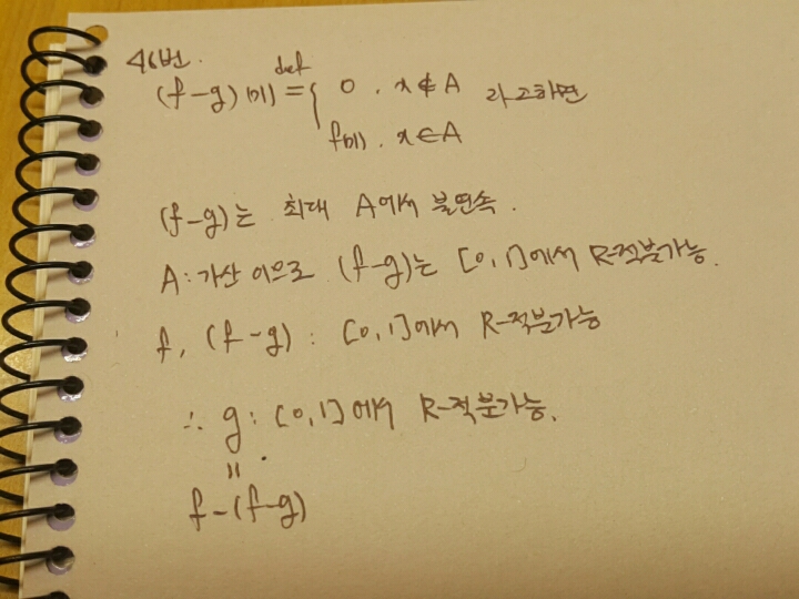 46번에서 첫번째 물음에 사진과 같이 풀이를 썼는데 수업때 풀이해주신걸보니 반례가 존재해서 g가 적분가능하지않더라구요