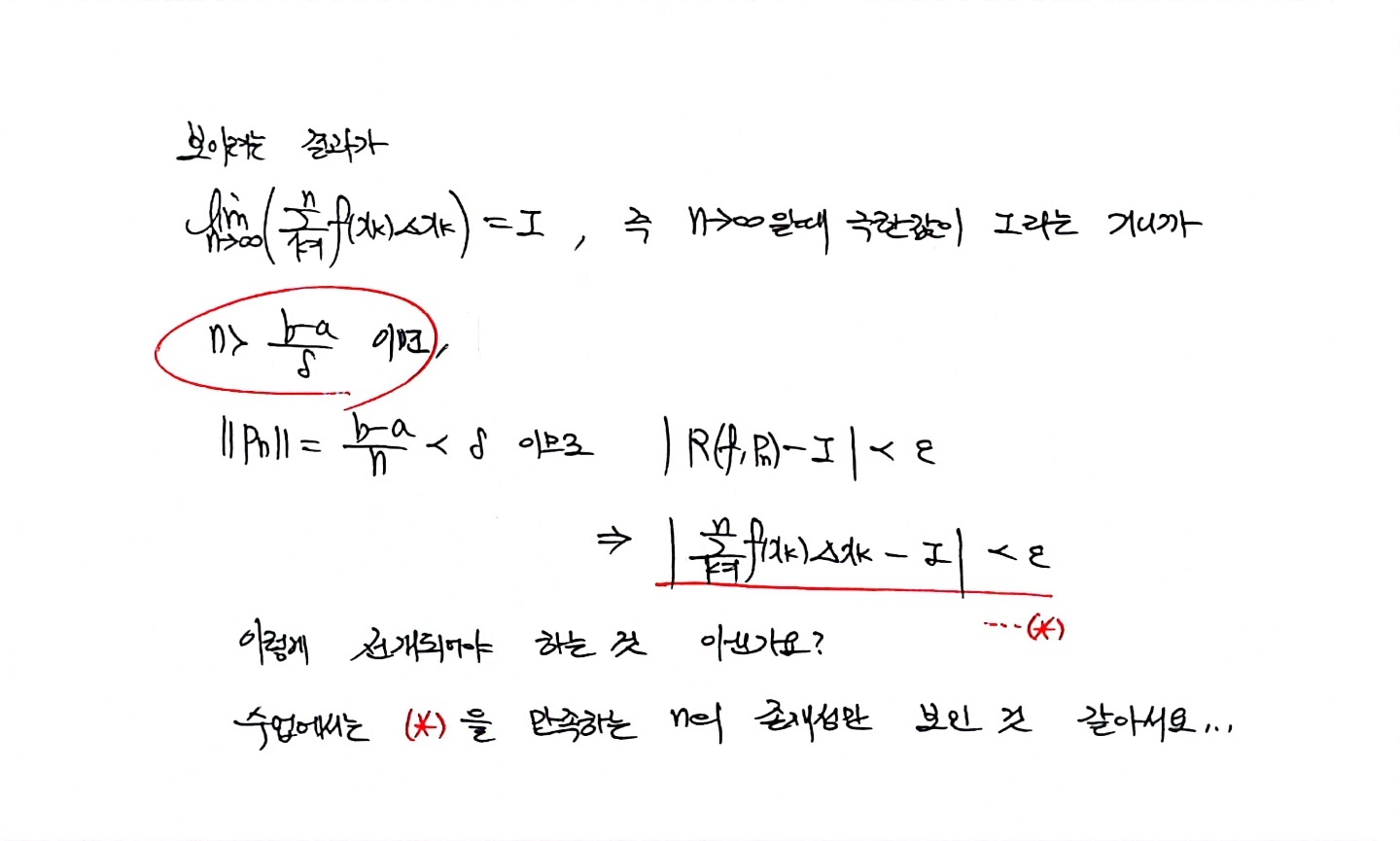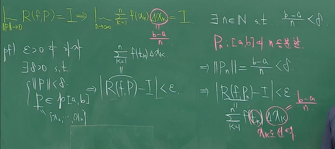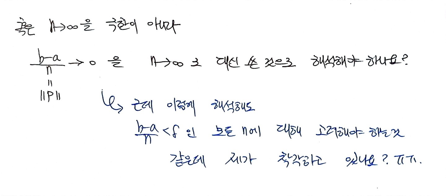 2. 뒷부분에 "m≥n이면 b-a/m ≤ b-a/n<δ를 만족하므로 m등분할 P_m도 필기 왼편의 성질을 만족하므로 풀어쓰면 m까지의 부분합과 I의 차의 절댓값이 ε보다 작아집니다."를 추가하면 증명이 끝납니다. -