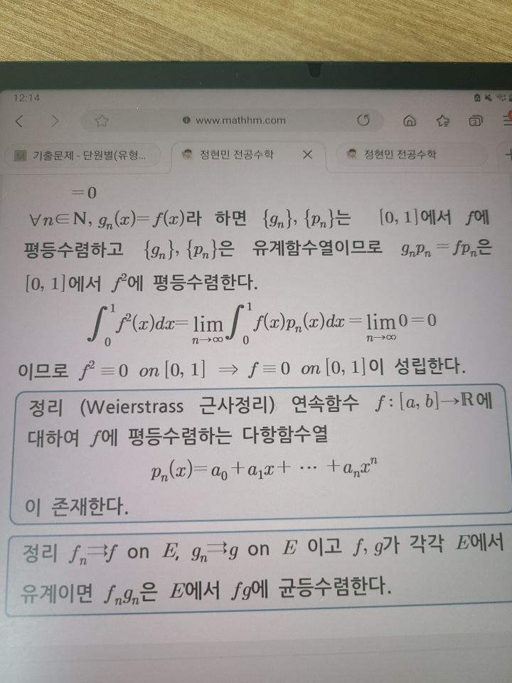 함수열의 곱 균등수렴하는 조건 질문입니다 작성자2021교사♡|작성시간21.04.06|조회수1,508 목록 댓글 1 글자크기 작게가 글자크기 크게가 fn,gn이 유계여야 하나요아니면f.g가 유계여야하는건가요?정리에는 극한함수 유계로 되어있는데증명에서는 유계함수열이라 성립한다고 되어있어서요ㅜ 다음검색 현재 게시글 추가 기능 열기 북마크 공유하기 신고 센터로 신고 댓글 댓글 1 댓글쓰기 답글쓰기 댓글 리스트 작성자김성희 | 작성시간 21.04.07 위 정리와 다른 조건들로도 같은 결론이 나옵니다. 관련 정리를 사진으로 첨부합니다. 이미지 확대 댓글 전체보기