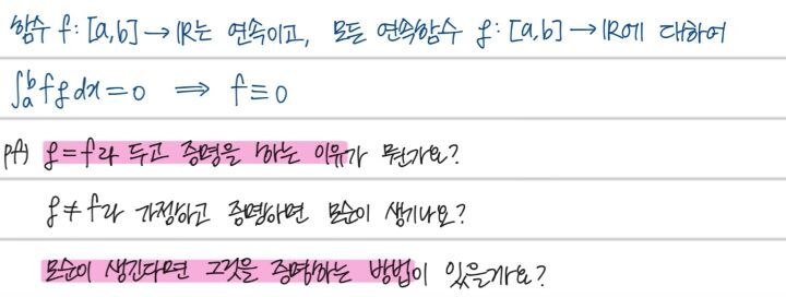 정동명 7.3 4번 질문 작성자짤랑쫄랑|작성시간21.05.08|조회수154 목록 댓글 1 글자크기 작게가 글자크기 크게가 왜 g=f라 하고 증명을 이어나가는지 도통 이해를 못하겠어요ㅠㅠ 다음검색 현재 게시글 추가 기능 열기 북마크 공유하기 신고 센터로 신고 댓글 댓글 1 댓글쓰기 답글쓰기 댓글 리스트 작성자김성희 | 작성시간 21.05.11 모든 연속함수에 g에 대해 ∫fg=0이라고 했으므로 그 중에 하나인 f를 g 자리에 대입해서 전개한 것입니다. g≠f인 g에 대해서는 구체적인 함수가 주어진게 아니어서 더이상 전개하기가 어렵습니다. 댓글 전체보기