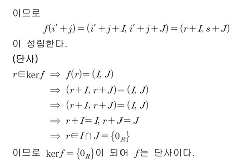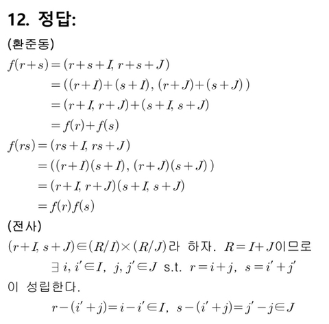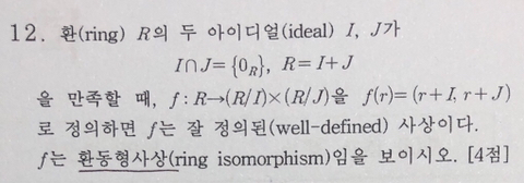 이 문제가 중국인의 나머지 정리 증명과 유사한 것 같은데, 중국인의 나머지 정리에서는 R이 단위원을 갖는 환이라는 조건이 있잖아요? 그 조건이 “전사” 증명할 때 쓰이는 걸로 알고 있는데요!
