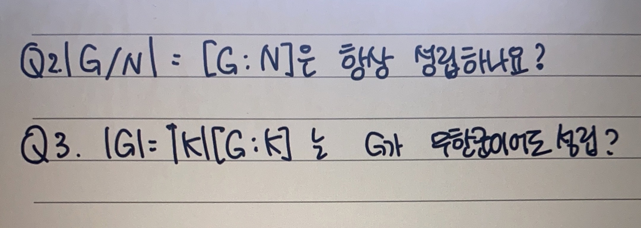 2. G/N이라는 표기는 군의 위수를 나타내며 G/N이 군이기 위한 필요충분조건은 N이 정규부분군이여야 하기 때문에 조건이 필요합니다.