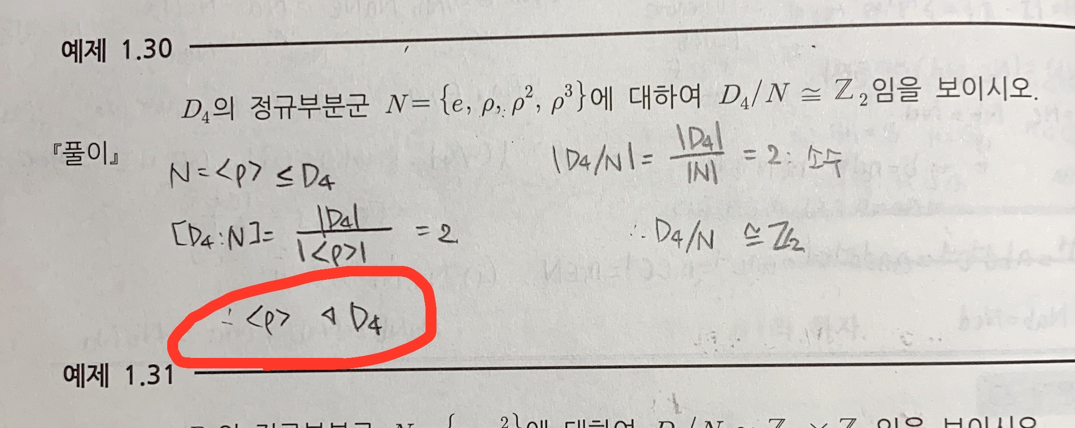 작성자쭈니99 작성시간 21.02.01 1. 정규부분군이라는 조건이 있어야만 G/N이 군이 됩니다. 다음 내용에서 D_4/N이 군이 되어야만 군 Z_2와 동형이 된다는 내용을 진행할 수 있어서 써준 것 같습니다.