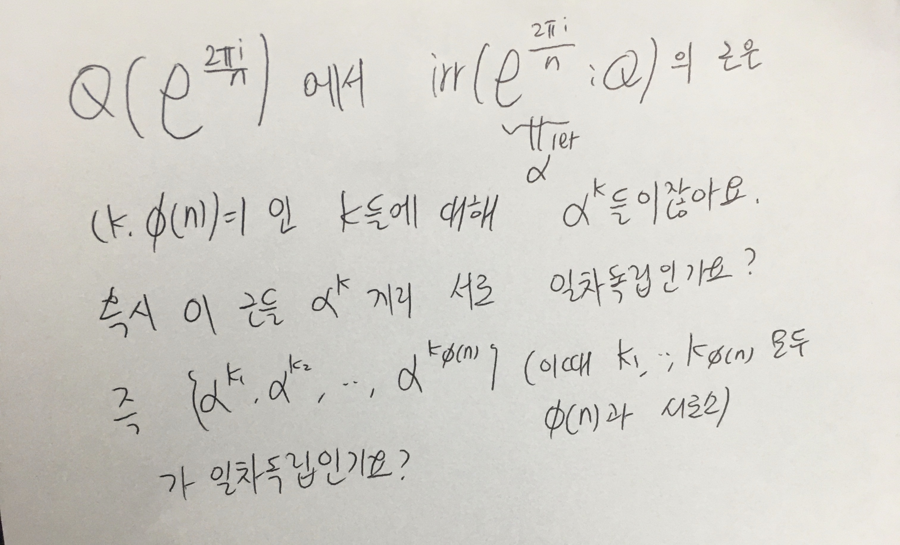 n=4인 경우 ζ=e^(2πi/4)라 하면 irr(ζ,Q)=x²+1의 해는 ζ(=i), ζ³(=-i)이고 {i,-i}는 일차독립이 아닙니다. -