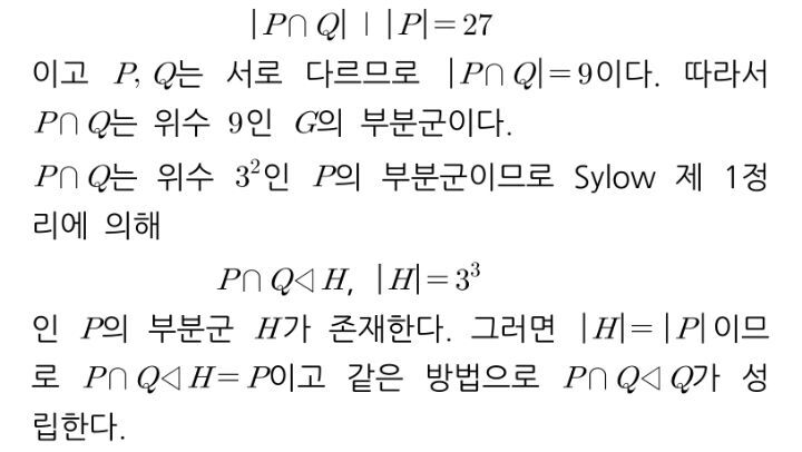 P와 Q의 교집합에 실로우 정리를 적용하면 P교Q를 정규부분군으로 갖는 위수 27인 G의 부분군 H가 존재하는데,