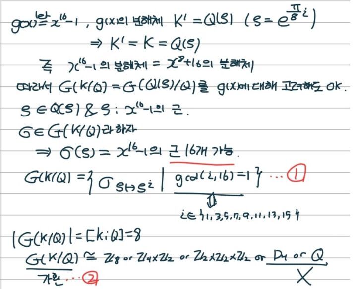 1번 동그라미를 보시면 106번 풀이 때 말씀해 주신것처럼 갈로아군의 대응하는 제타들이 16과 서로소인 정수들만 대응이 남는다고 언급해주셨습니다.