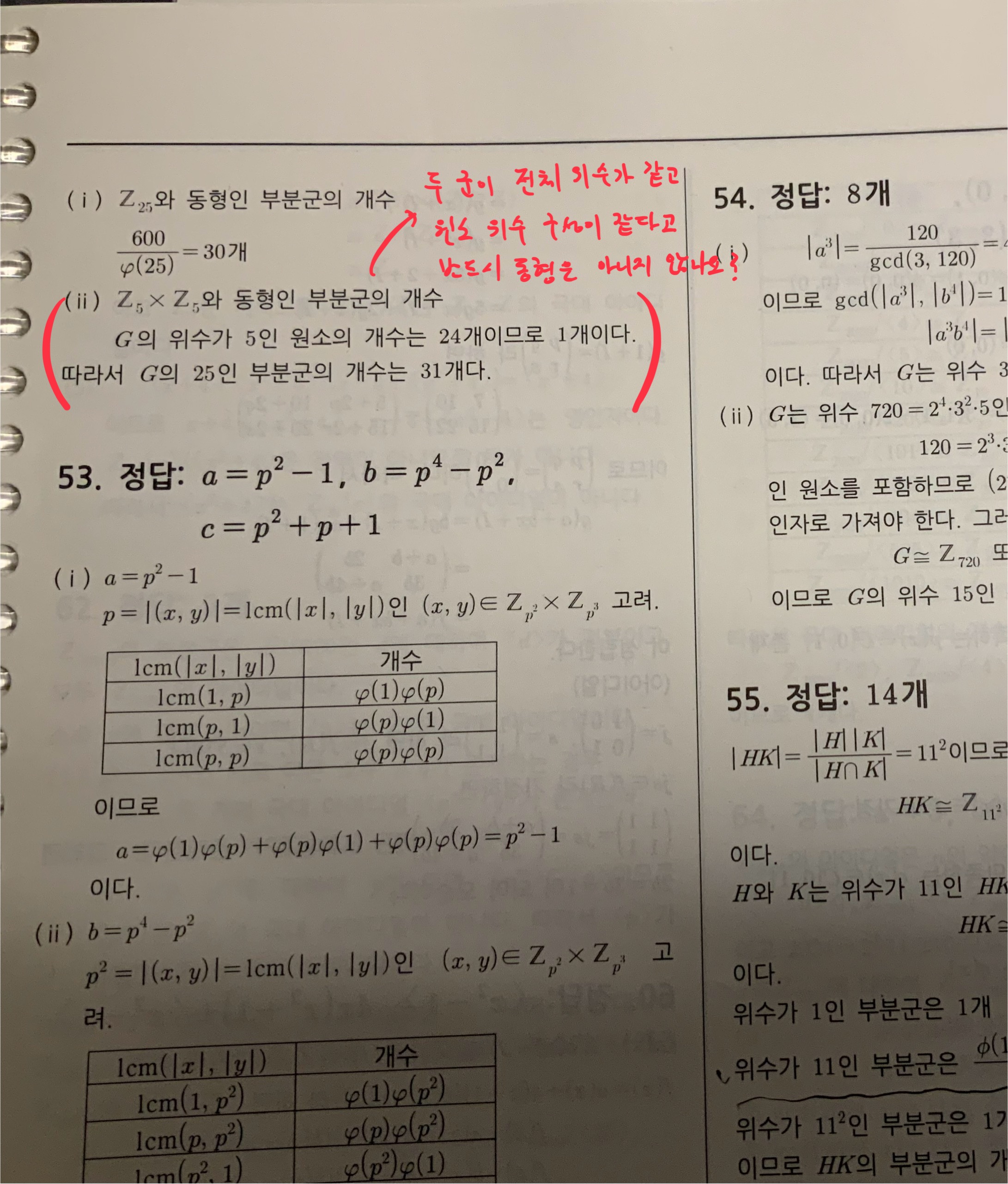 78 문풀 52번 작성자한끝경합|작성시간25.11.17|조회수47 목록 댓글 1 글자크기 작게가 글자크기 크게가 저번에 질문드렸었는데 다시 풀어보다 헷갈려서 질문드립니다. 다음검색 현재 게시글 추가 기능 열기 북마크 공유하기 신고 센터로 신고 댓글 댓글 1 댓글쓰기 답글쓰기 댓글 리스트 작성자수정과 | 작성시간 25.11.18 두 군의 위수가 같고 위수가 같은 원소들의 개수가 같다고 하여 일반적으로 두 군이 동형이라 할 수 없습니다. (예: Z₄XZ₄, QXZ₂)다만 이 문제의 상황에서는 G가 가환군이므로 유한 가환군의 기본정리에 의해 해설과 같이 서술할 수 있습니다. 댓글 전체보기