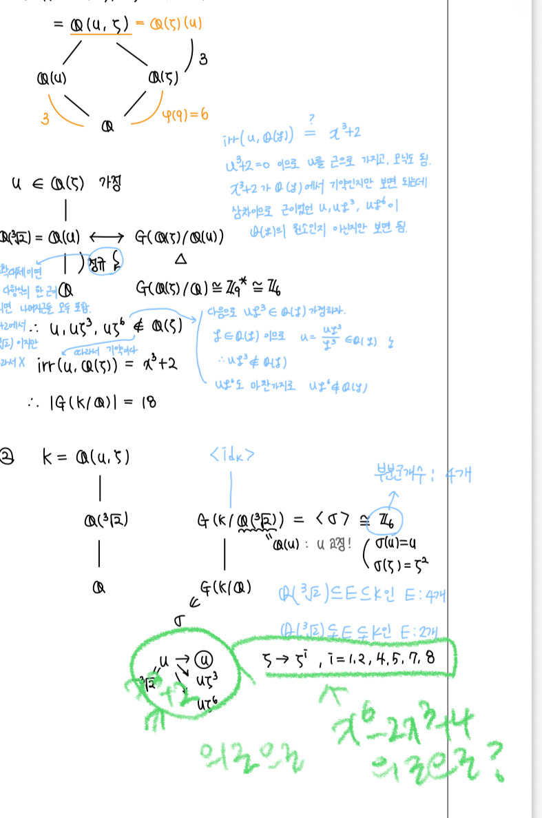 답댓글 작성자수정과 작성시간 25.11.21 지니티 동시에 사용한다는 것이 정확히 어떤 의미이신가요? 정리가 알려주는 내용은 u를 근으로 가지는 다항식 f(x)에 대해 갈루아군의 원소 σ에 대한 σ(u) 또한 f(x)의 근이 됨을 알려주는 정리입니다.