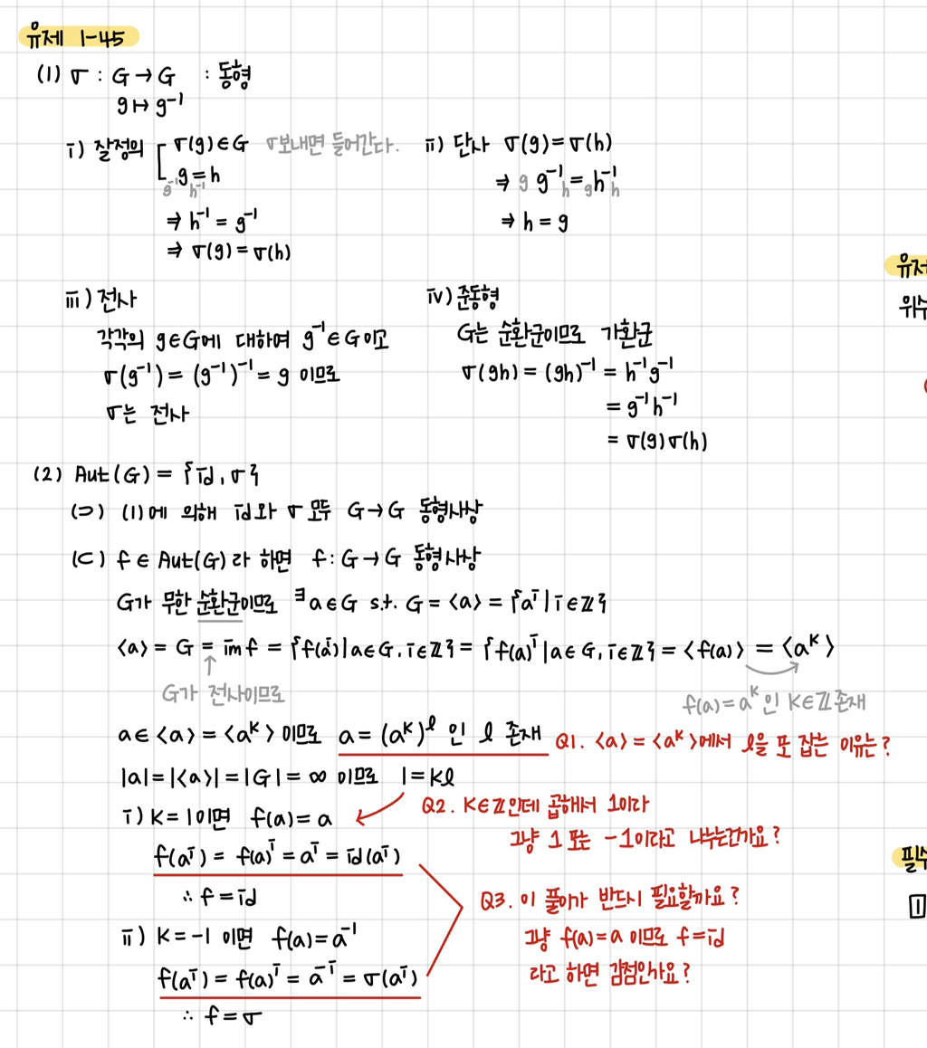 ③ f가 군 동형사상이고 a가 군 G의 생성원이므로 f(a)=a ⇒ f=id, f(a)=a^-1 ⇒ f=σ 라 할 수 있습니다. 다만 채점시 감점여부는 채점기준 및 채점자에 따라 달라지므로 확답을 드리기 어렵습니다.
