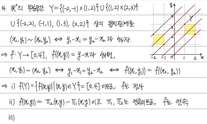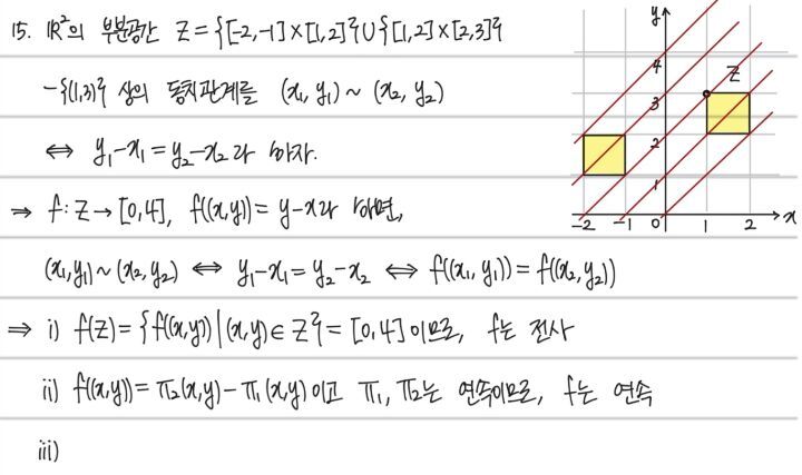 원래는 14, 15번이 (a)번에서 상공간이 연결임을, (b)번에서 상공간이 컴팩트임을 보이라고 하고 (c)번에서 위상동형임을 보이라고 하는 문제인데, 위상동형임을 먼저 보이면 연속•전사임을 이용하여 상공간이 연결•컴팩트임을 보이려고 (c)번을 먼저 해결하려하니 복잡하네요😰