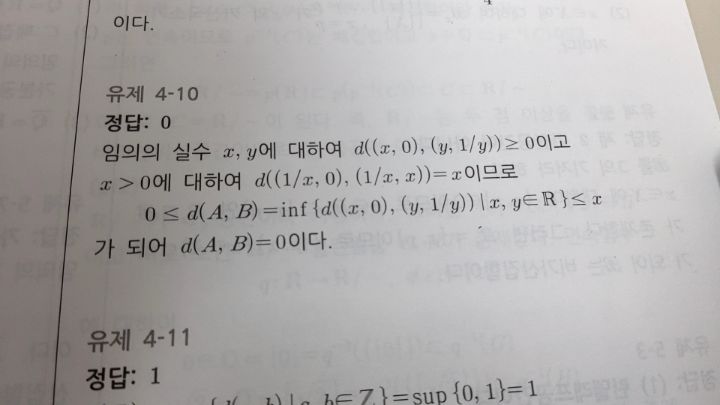 작성자수정과 작성시간 23.04.27 ①,② x>0에 대해 x=d((1/x,0),(1/x,x))∈{d((a,0),(b,1/b)) | a∈ℝ,b∈(0,∞)}이므로 하한의 정의에 의해 d(A,B)≤x가 성립합니다. 즉 x>0인 임의의 x에 대해 0≤d(A,B)≤x이므로 d(A,B)=0가 성립함을 알 수 있습니다. (임의의 ε>0에 대해 0≤A≤ε ⇒ A=0 은 해석학에서 종종 쓰였던 내용입니다.)